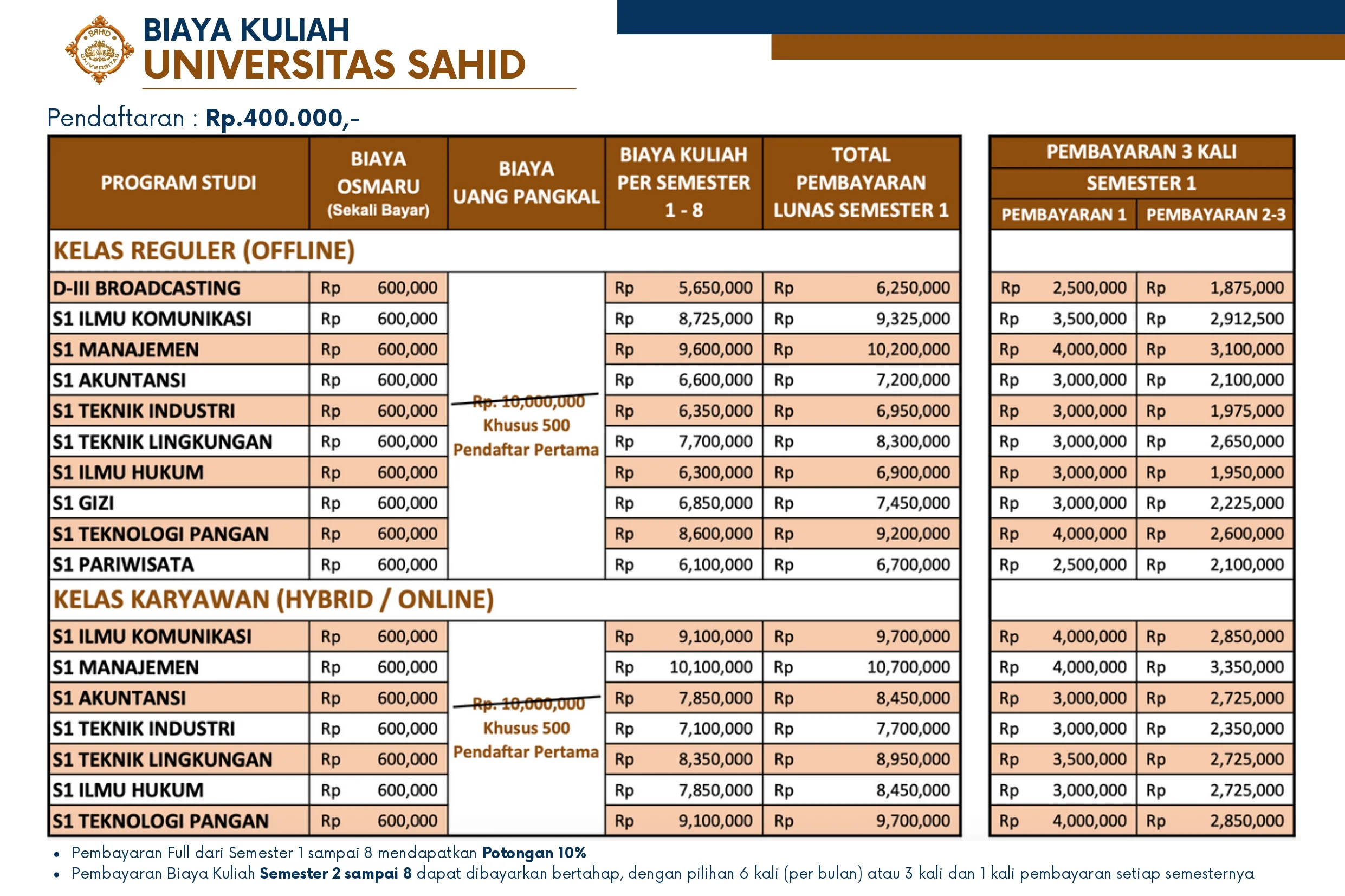 - Uang Pangkal / SPP Awal: Rp 10.000.000,- hingga Rp 15.000.000,- tergantung program studi
